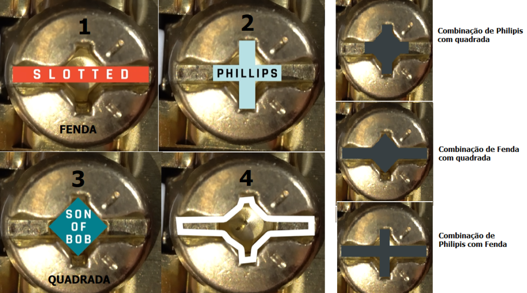 Conforme ilustrado na imagem, a cabeça do parafuso utilizado em muitas aplicações possui diferentes combinações de encaixe: