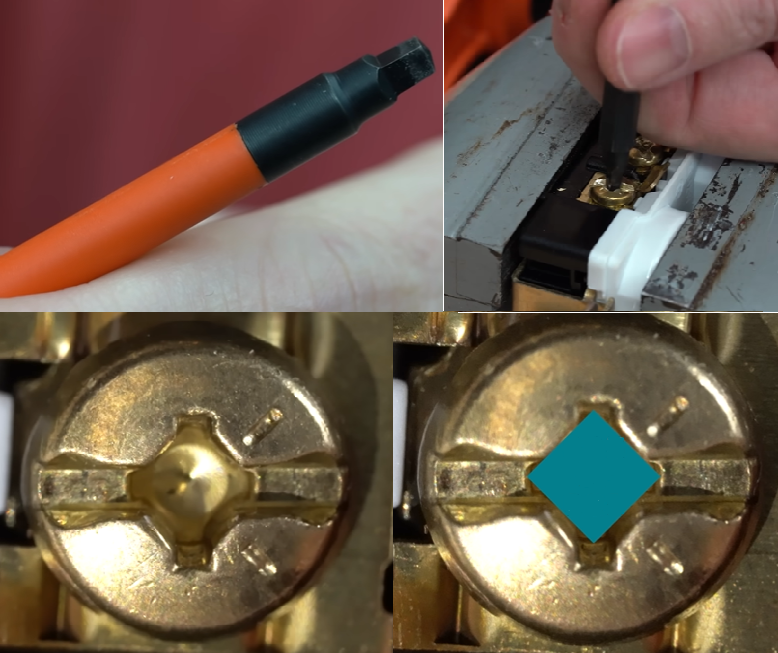 Muitos parafusos utilizados em elétrica possuem encaixe combinado (Phillips + quadrado). Embora seja possível usar a Phillips nesses parafusos, o encaixe quadrado proporciona contato mais firme e eficiente.